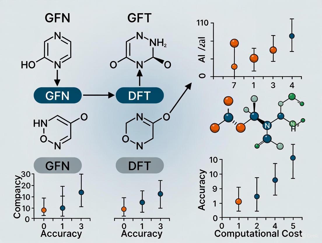 As computational demands continue to grow in pharmaceutical development and materials design, the strategic integration of GFN methods into multi-scale computational workflows will become increasingly valuable. By leveraging GFN methods for initial screening and conformational analysis, followed by targeted DFT calculations for final validation, researchers can optimize the trade-off between computational speed and predictive accuracy in molecular design pipelines.